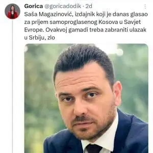 Podršku je iskazao javno nakon što je kćerka predsjednika bh. entiteta RS Milorada Dodika Gorica prozvala Magazonovića “izdajicom” te poručila da je njemu treba zabraniti ulazak u Srbiju. Ova oštra reakcija je uslijedila nakon što je Saša Magazinović glasao za prijem Kosova u Vijeće Evrope.