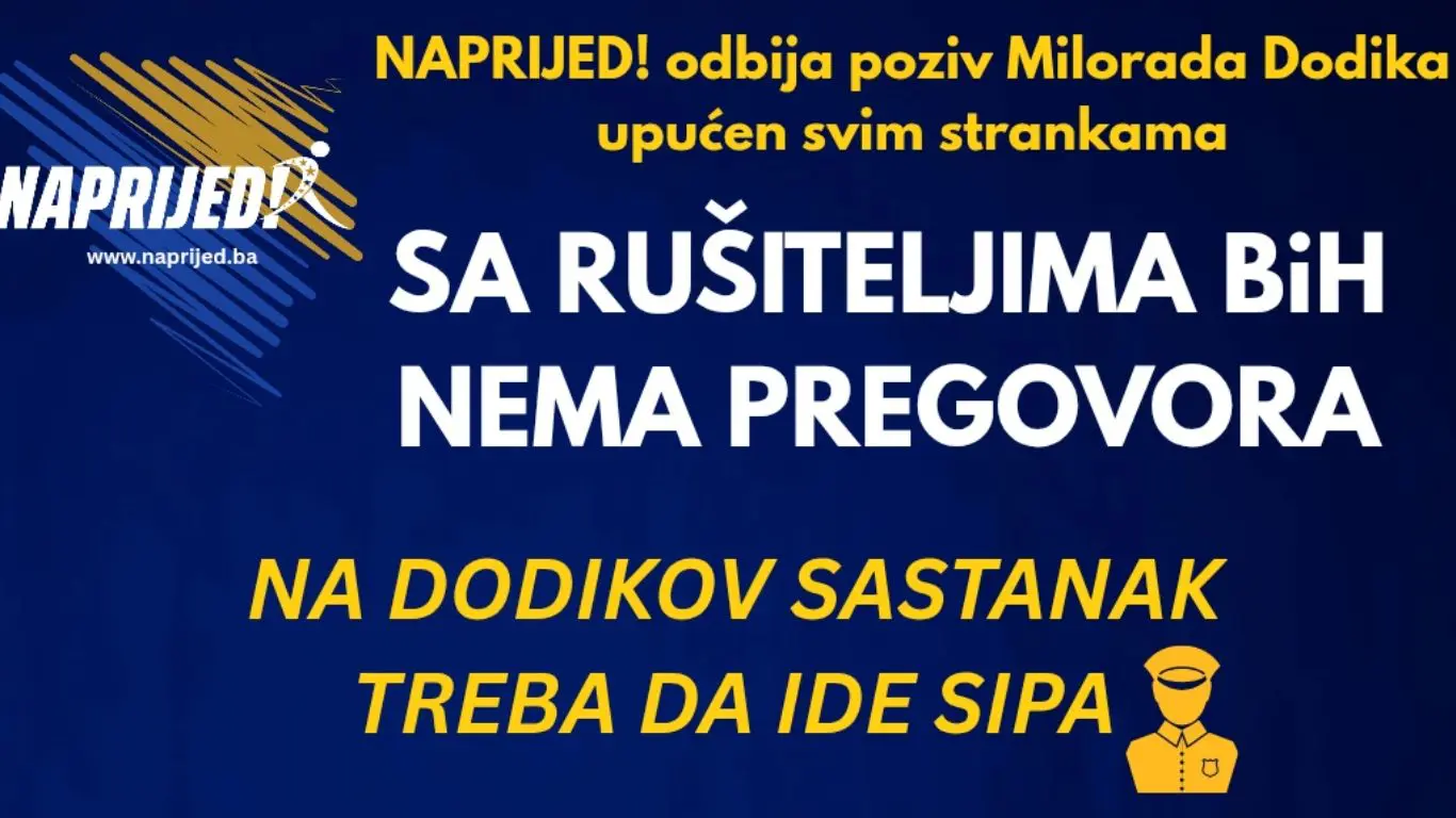 Stranka NAPRIJED! jasno i odlučno odbija poziv Milorada Dodika upućen svim političkim strankama na sastanak. Nećemo, niti možemo sjediti za istim stolom s osobom koja godinama ruši ustavni poredak, potkopava suverenitet Bosne i Hercegovine i otvoreno poziva na njeno razbijanje.
