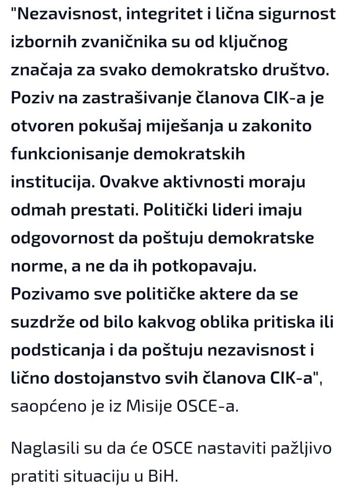pozivamo sve političke aktere da se uzdrže od retorike koja huška, prijeti i dijeli. Uloga izborne komisije nije da se pokorava političkim liderima, već da štiti zakon, demokratske procedure i pravo građana na slobodne i poštene izbore.