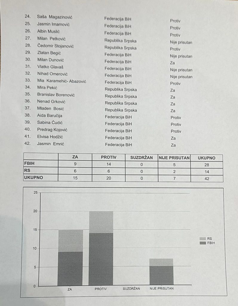 Zastupnici su, u okviru 15. tačke dnevnog reda, glasali o ovom prijedlogu. Na glasanju je 15 zastupnika podržalo prijedlog, dok je 20 bilo protiv. Ovaj rezultat jasno pokazuje da stavovi Trojke, koja u javnosti kritikuje SNSD i HDZ, u praksi suprotni njihovim izjavama. Javne riječi i stvarna politička djela kod njih su u potpunoj disproporciji.