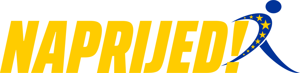 Sam tekst “NAPRIJED” na logu blago je nagnut prema naprijed, što dodatno naglašava dinamiku za iskorakom i izlaskom iz stagnacije i teškoća koje nas trenutno opterećuju.
